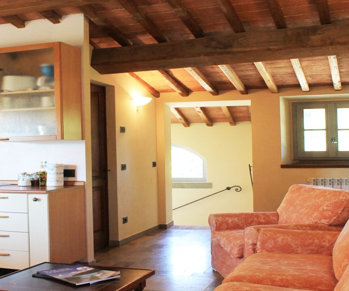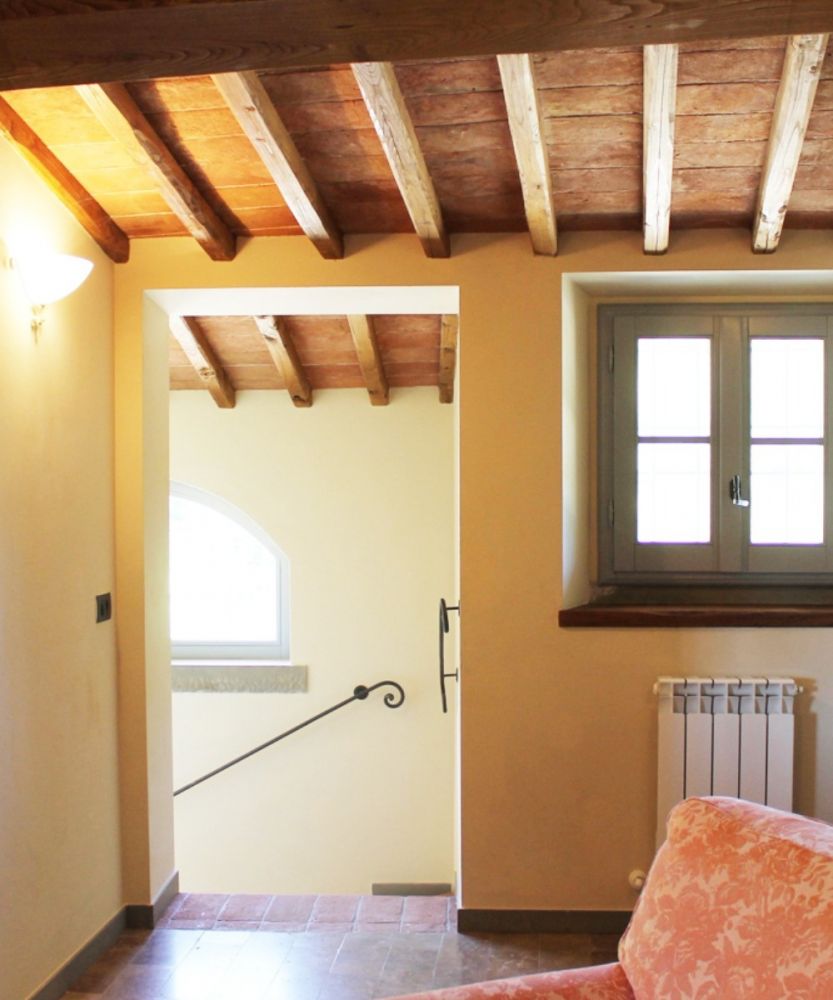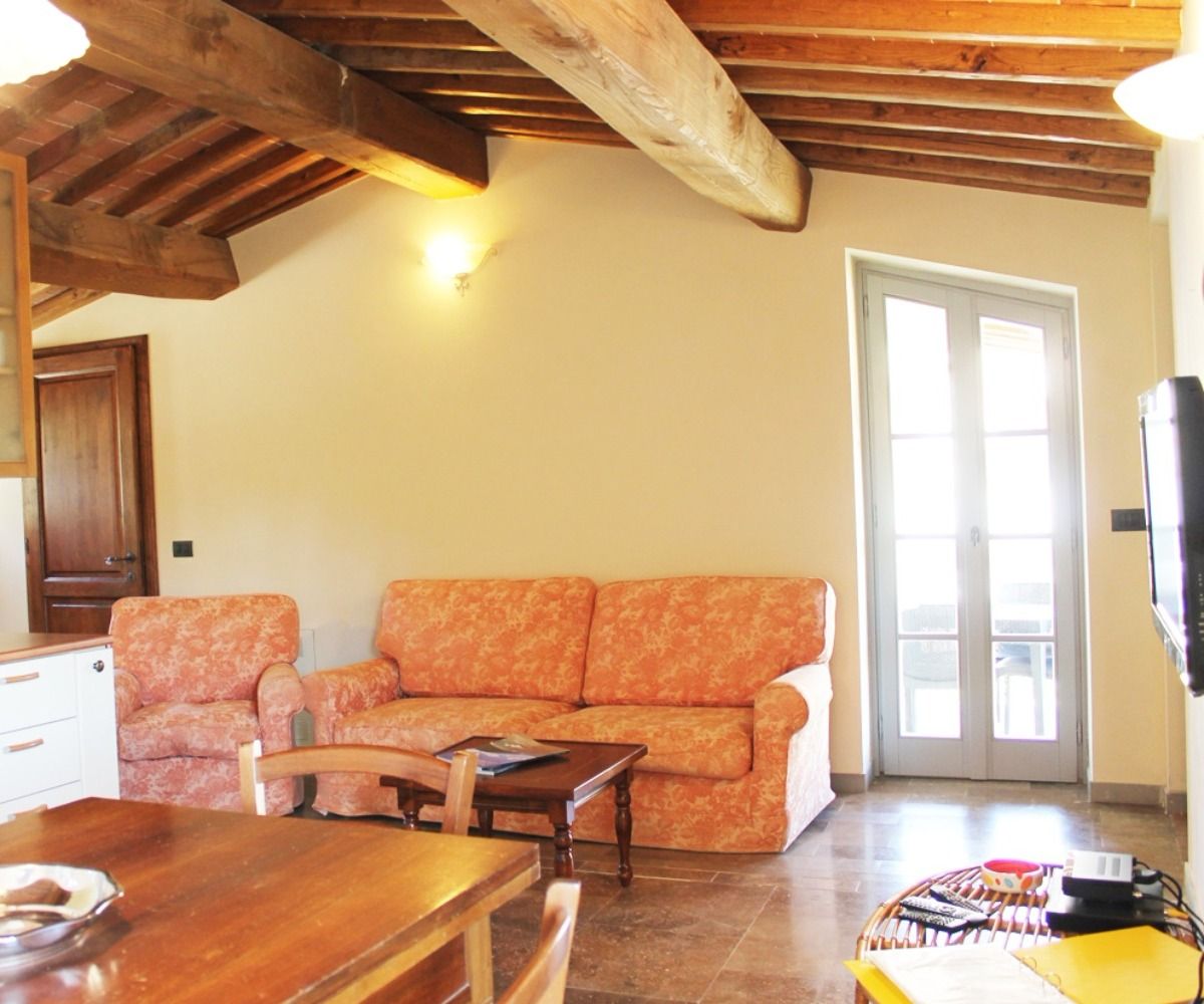 Una scala interna porta al pianerottolo di ingresso dell’appartamento, che immette in un soggiorno-pranzo con angolo cottura ed una deliziosa terrazza panoramica attrezzata per mangiare al fresco. Dalla zona giorno si accede a una camera doppia e a un bagno con vasca. Un disimpegno conduce alla seconda camera, una camera matrimoniale, e al bagno en-suite con doccia.
