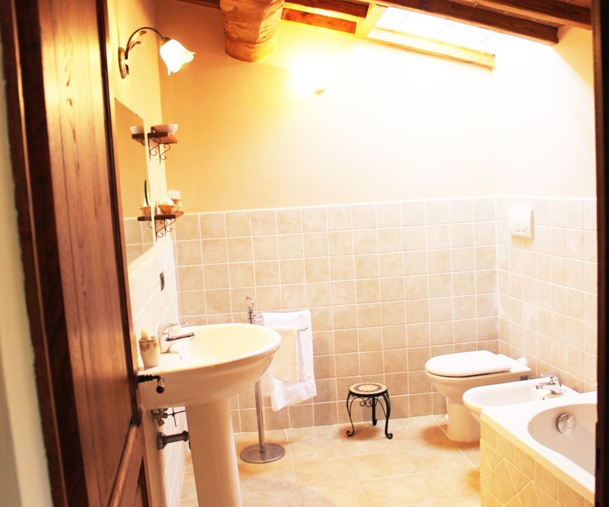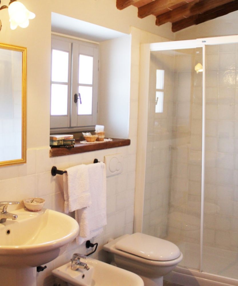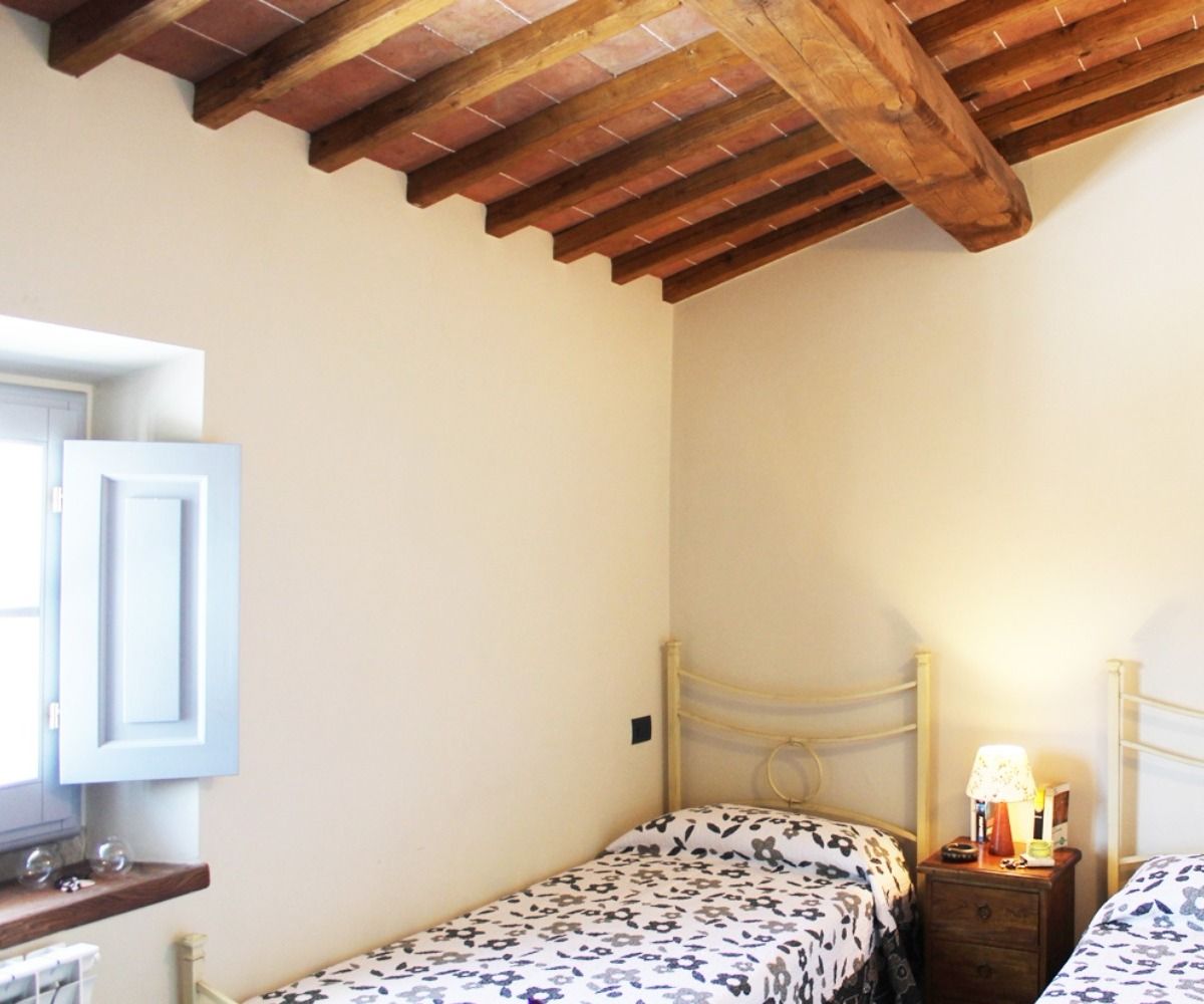 Una scala interna porta al pianerottolo di ingresso dell’appartamento, che immette in un soggiorno-pranzo con angolo cottura ed una deliziosa terrazza panoramica attrezzata per mangiare al fresco. Dalla zona giorno si accede a una camera doppia e a un bagno con vasca. Un disimpegno conduce alla seconda camera, una camera matrimoniale, e al bagno en-suite con doccia.
